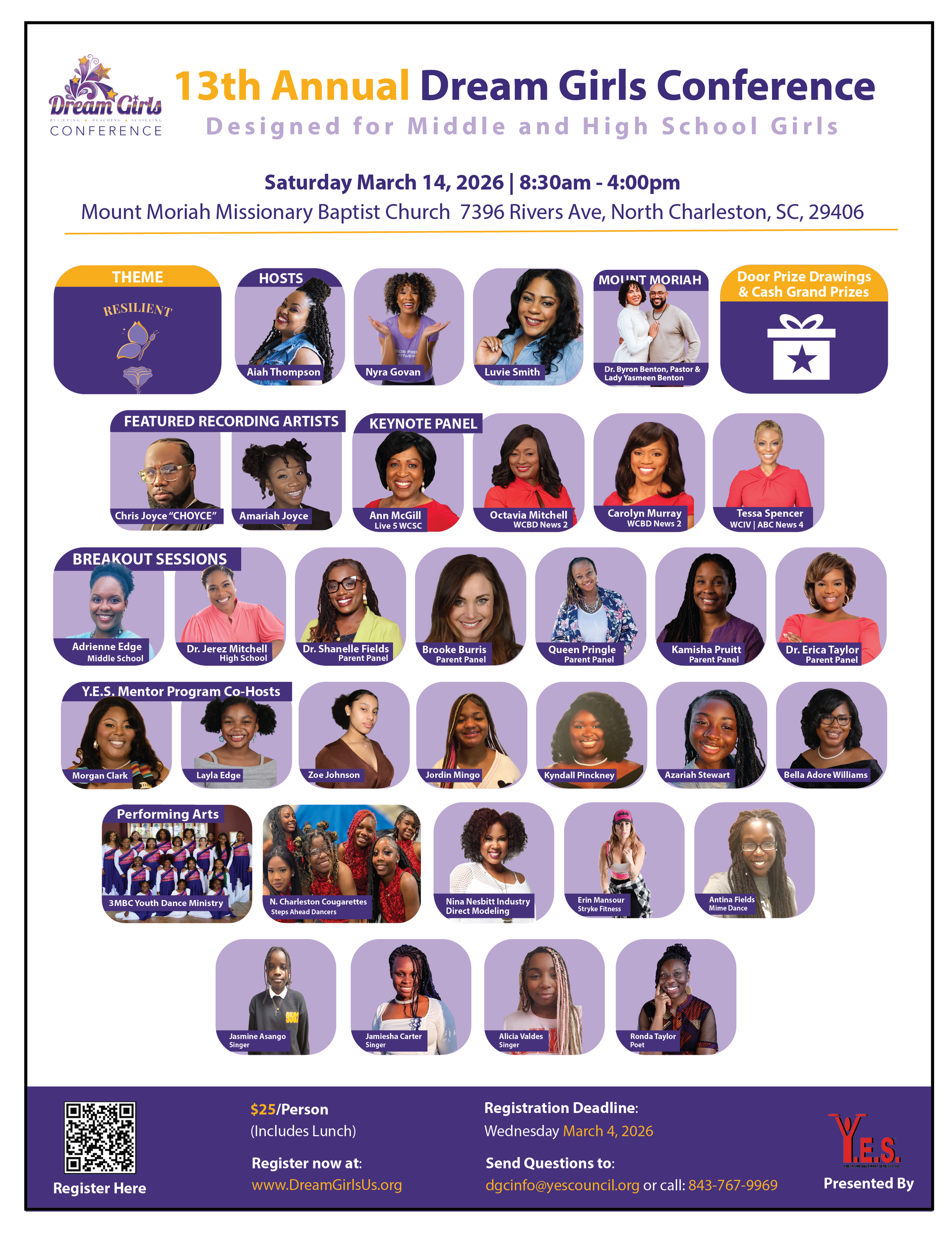 Dream Girls Us is the flagship program and outreach sponsored by Y.E.S. Dream Girls US is an annual conference that is specifically designed for at-risk middle and high school girls to empower them with strategies and resources to help them make wise decisions. In 2014, Y.E.S. sponsored the first annual conference that is held in North Charleston. Over 2,000 attend the conference each year from over 60 cities across South Carolina as well as other states. The conference is a catalyst for longterm involvement with Y.E.S. programs and resources, especially for those offered in the Tri-County of Berkeley, Charleston, and Dorchester Counties of South Carolina. The conference features motivational speakers, vendors from colleges, social service agencies, and businesses that share valuable information and resources with the girls and their parents.